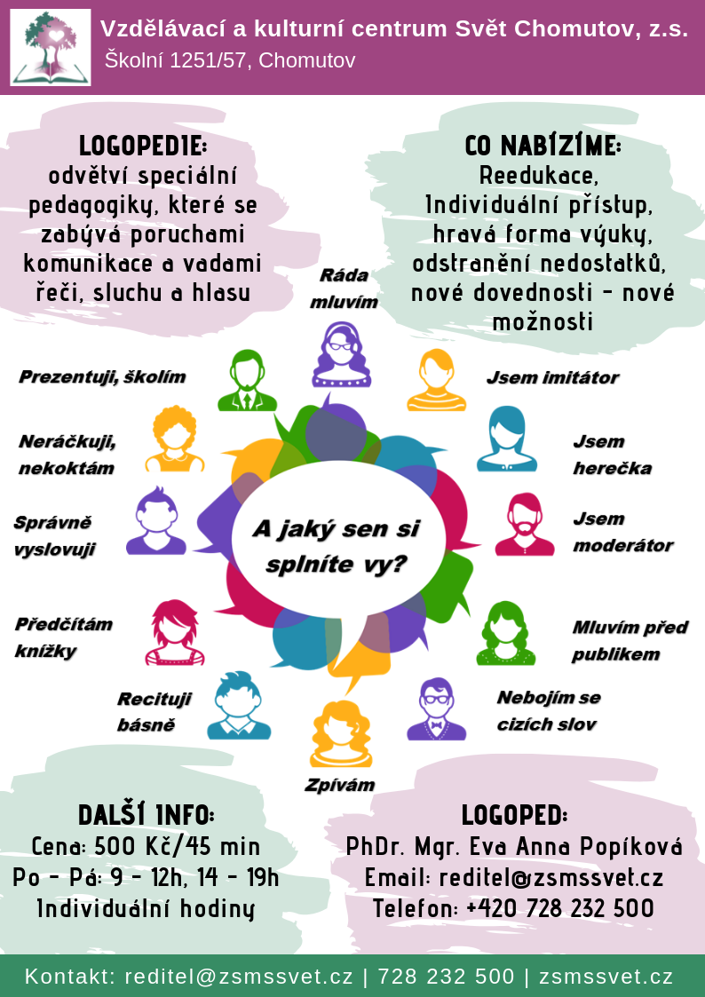,,Školní logopedie" při Základní škole Svět se zabývá poruchami komunikace, vadami řeči, sluchu a hlasu.